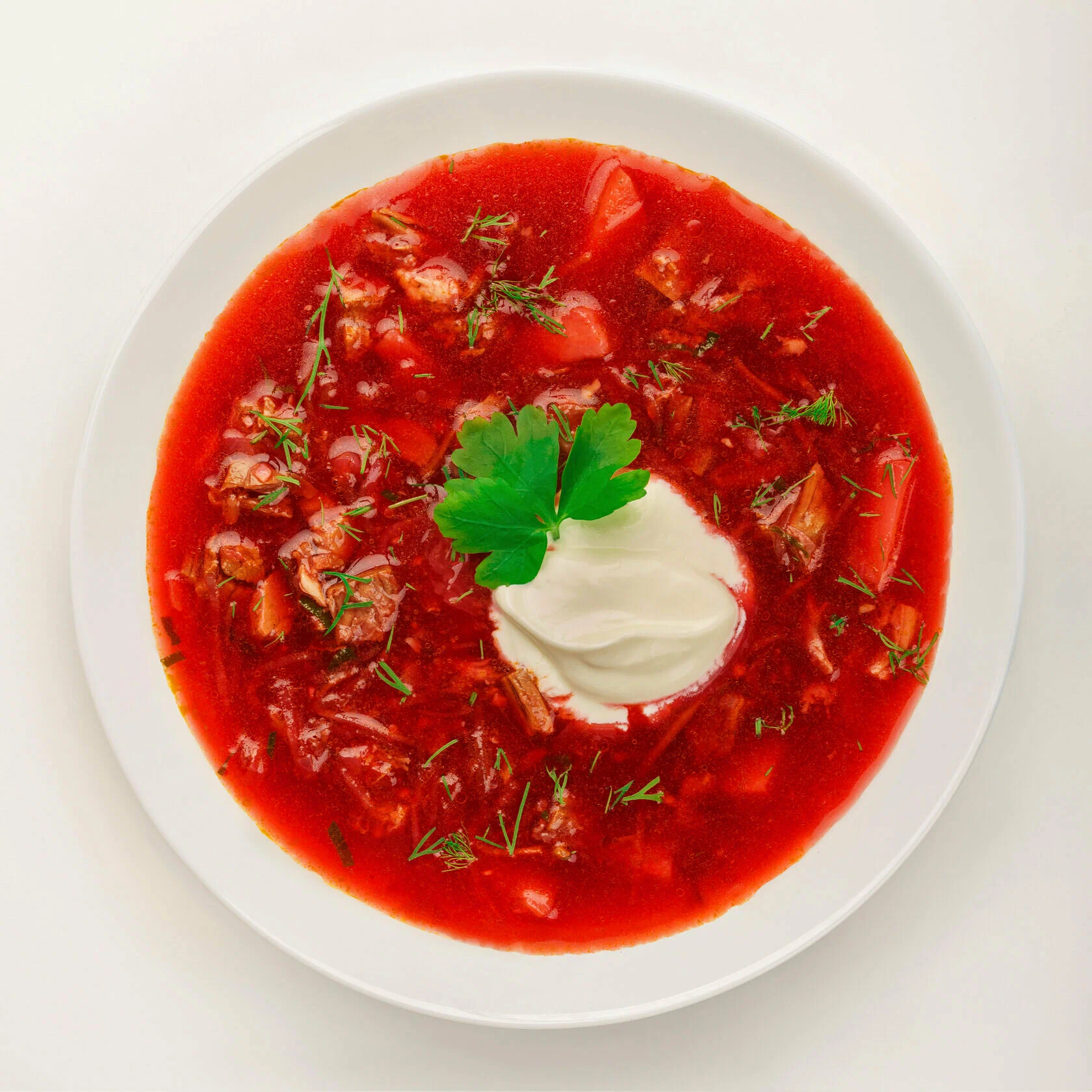 Бульон говяжий костный, свекла свежая, картофель свежий, мясо отварное (говядина), капуста квашенная, морковь свежая, масло подсолнечное рафинированное, томатная паста, лук репчатый свежий, соль поваренная пищевая, сахар-песок, перец чёрный молотый, петрушка (зелень) сушёная, лавровый лист.