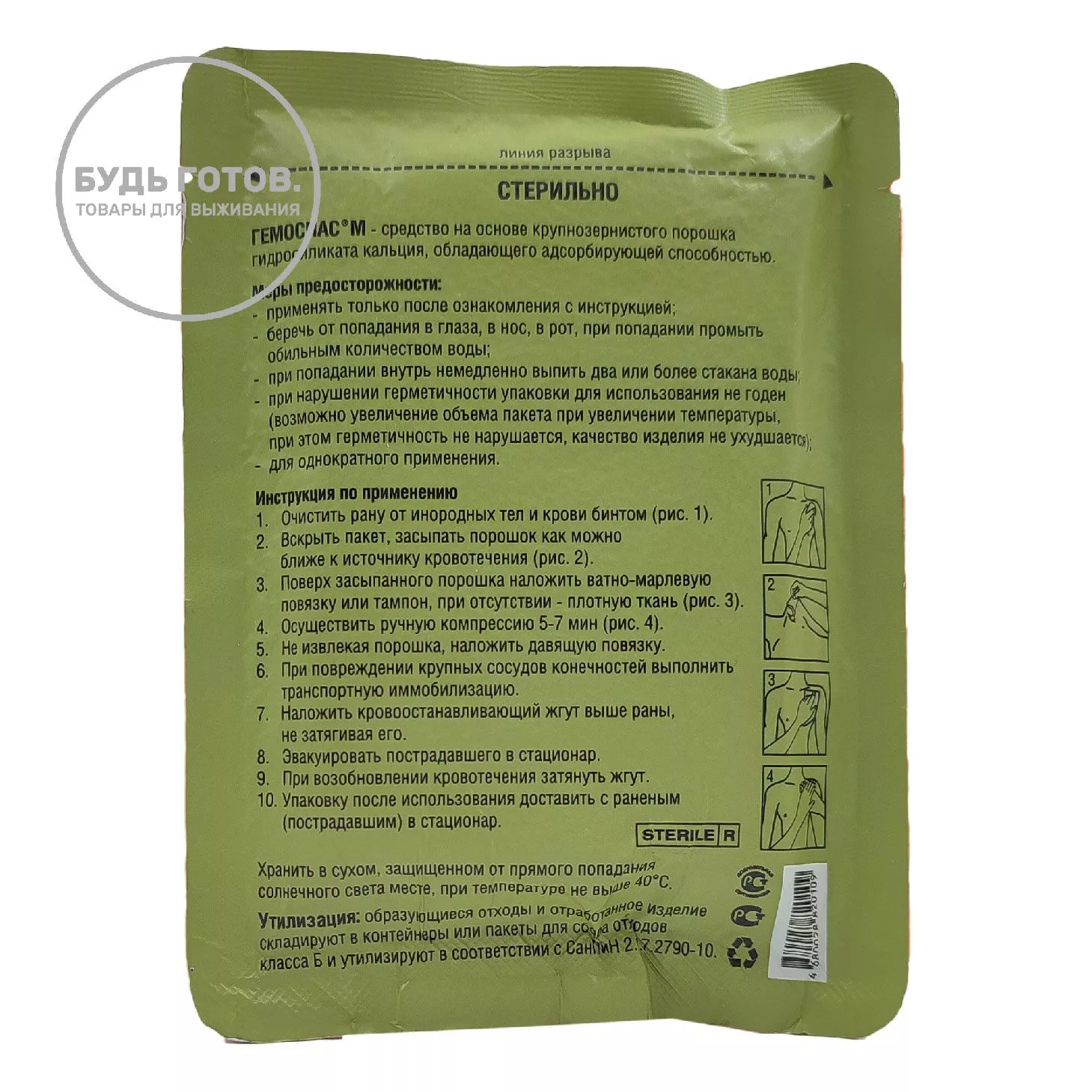 - Работает без выделения тепла, в отличие от других минеральных кровоостанавливающих средств, таких, как QuikClot первых поколений;